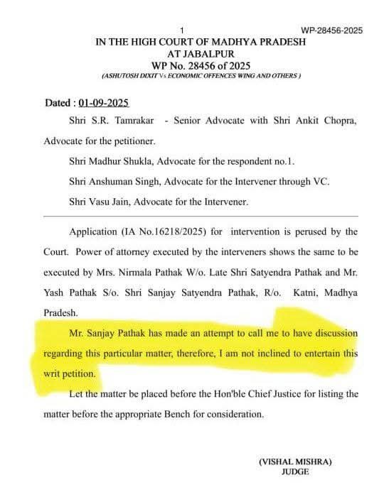 Justice Vishal Mishra of the Madhya Pradesh High Court on Monday (September 01) recused from an illegal mining case, stating that BJP MLA from Vijayraghavgarh assembly constituency— Sanjay Pathak, tried to call him to have a discussion regarding the case.